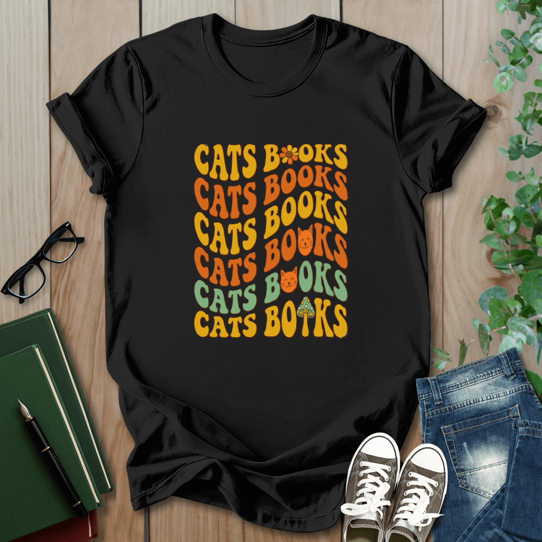70s Retro, Cats & Books - T-Shirt